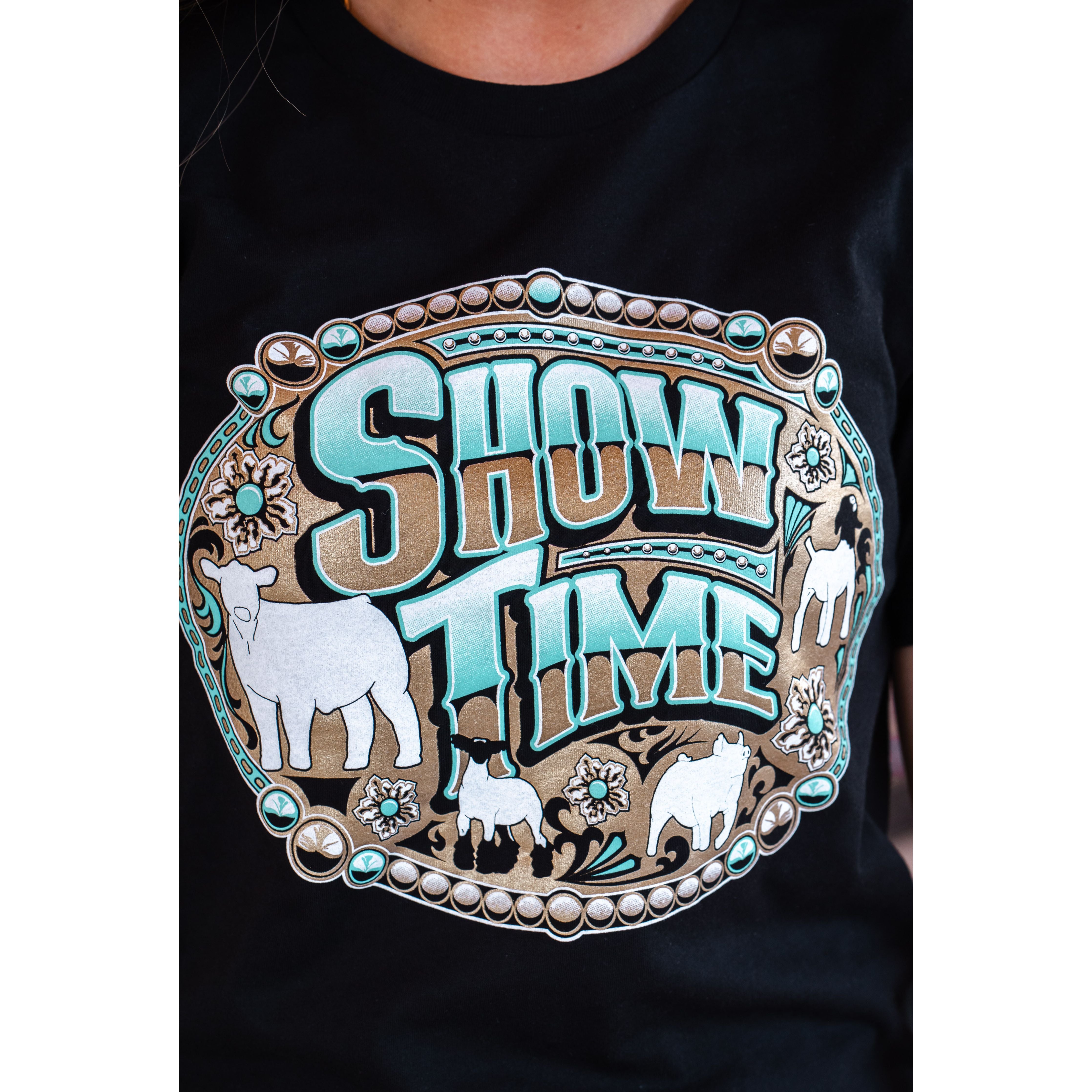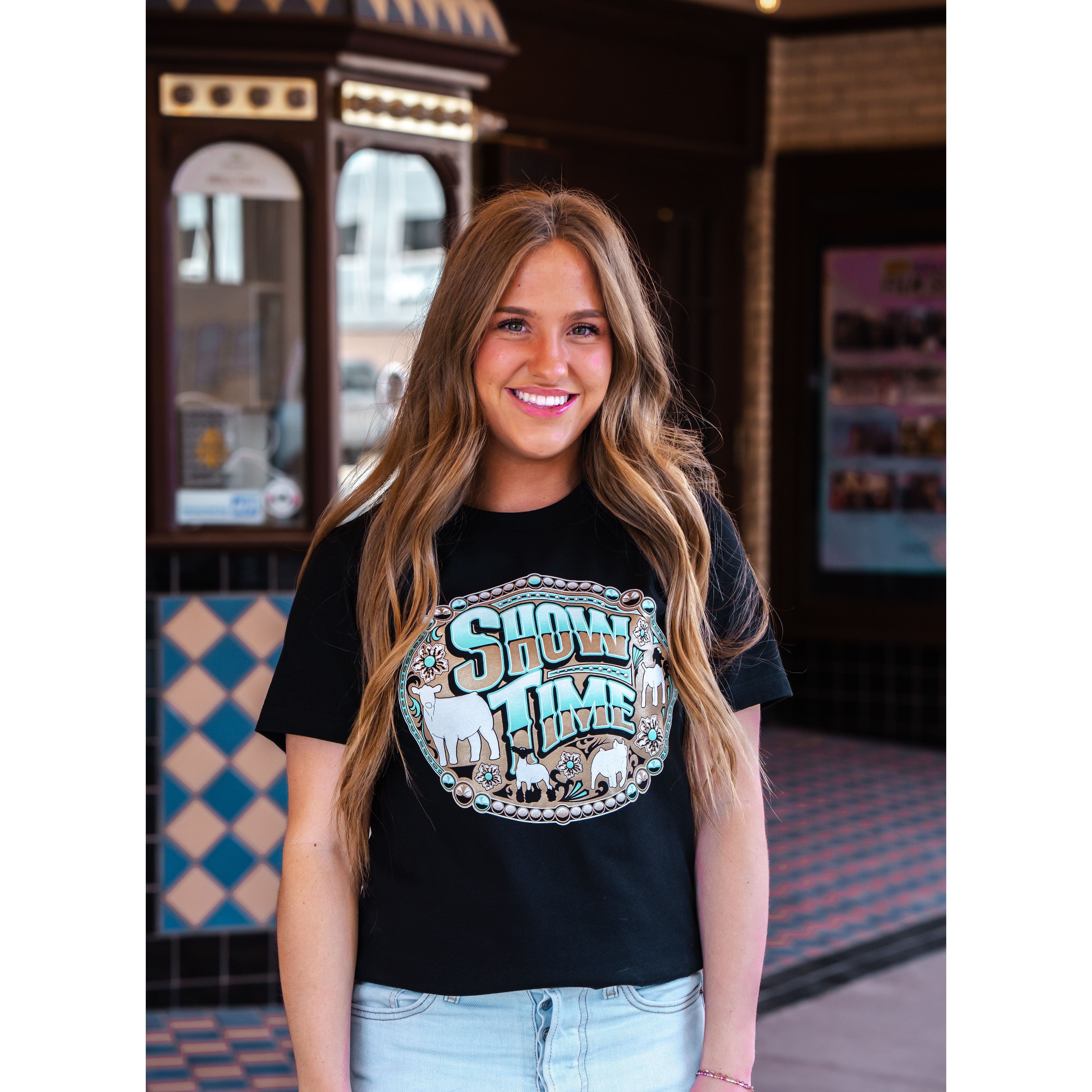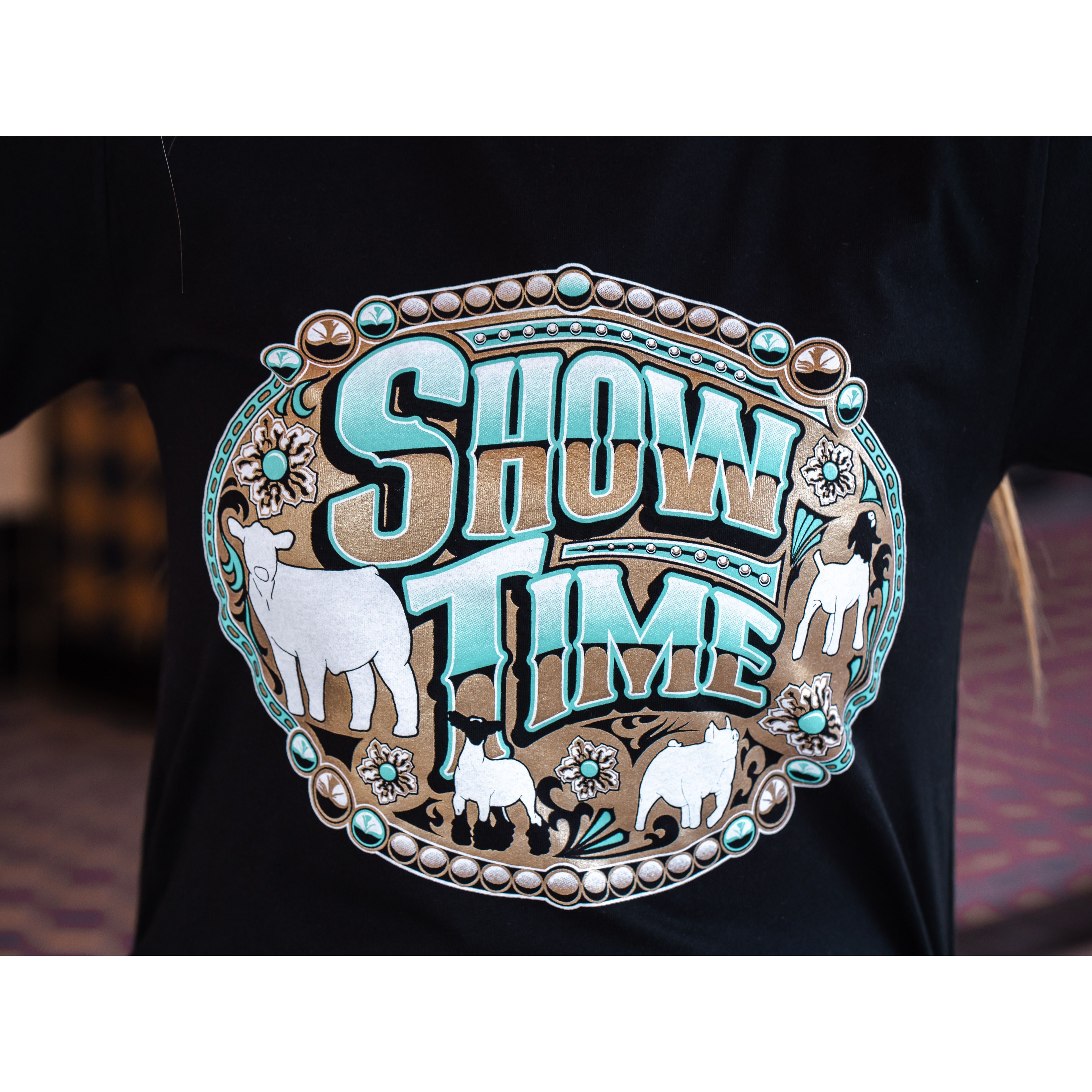 Get ready to shine at the show ring! This eye-catching "Show Time" graphic tee is perfect for livestock show enthusiasts who live and breathe the stock show life. Featuring a vibrant western-inspired design with show animals and a bold buckle motif, this tee lets everyone know you're ready to bring your A-game.