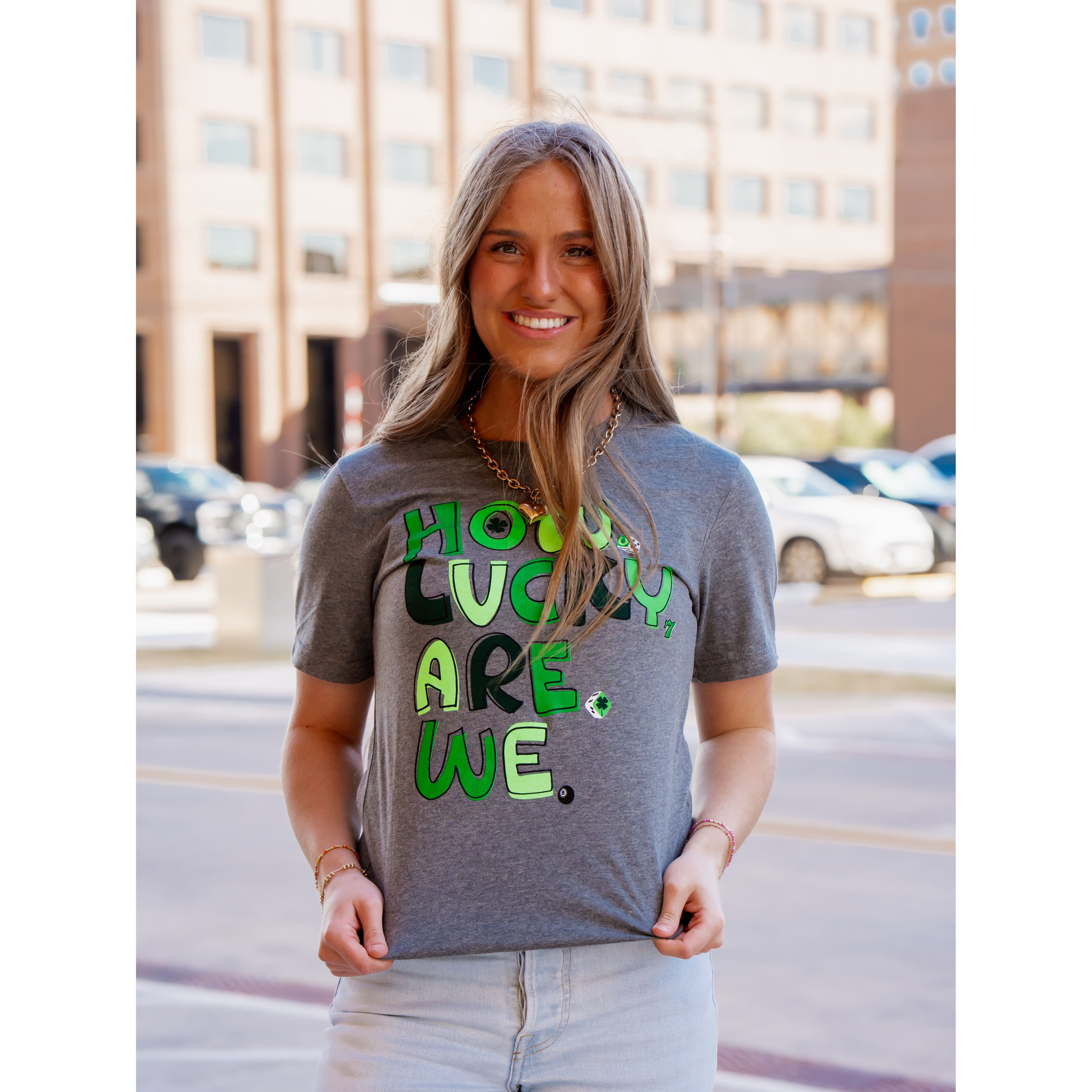 How lucky are we? Celebrate St. Patrick's Day in style with this fun and festive graphic tee! Featuring playful lucky symbols including shamrocks, horseshoes, dice showing lucky 7s, and vibrant neon accents, this tee is perfect for showing off your Irish spirit and good luck vibes.