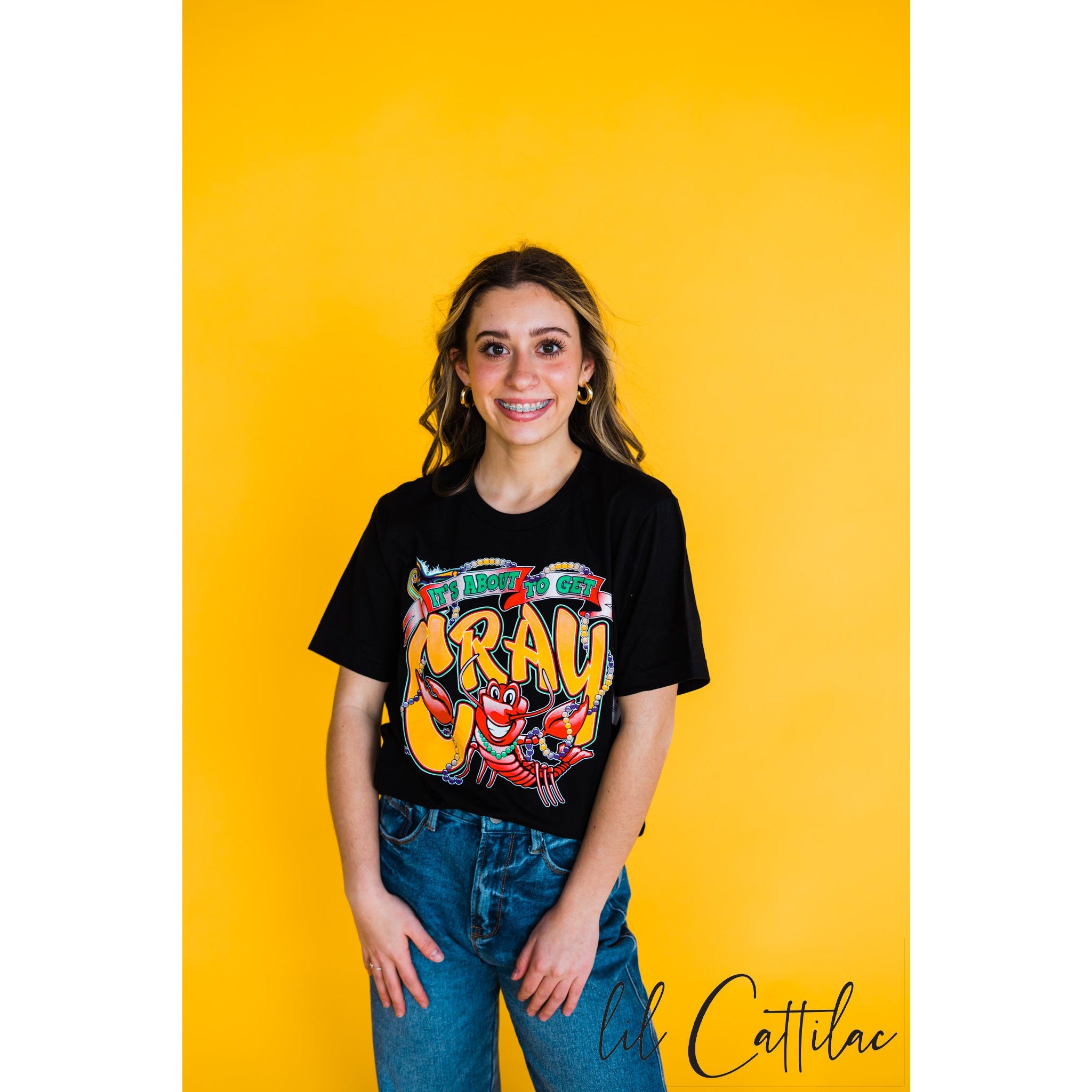 Let them know upon walking through the door that It's about to get crazy! This Black t-shirt with a crawfish smiling and holding beads will be a focal point of the party.