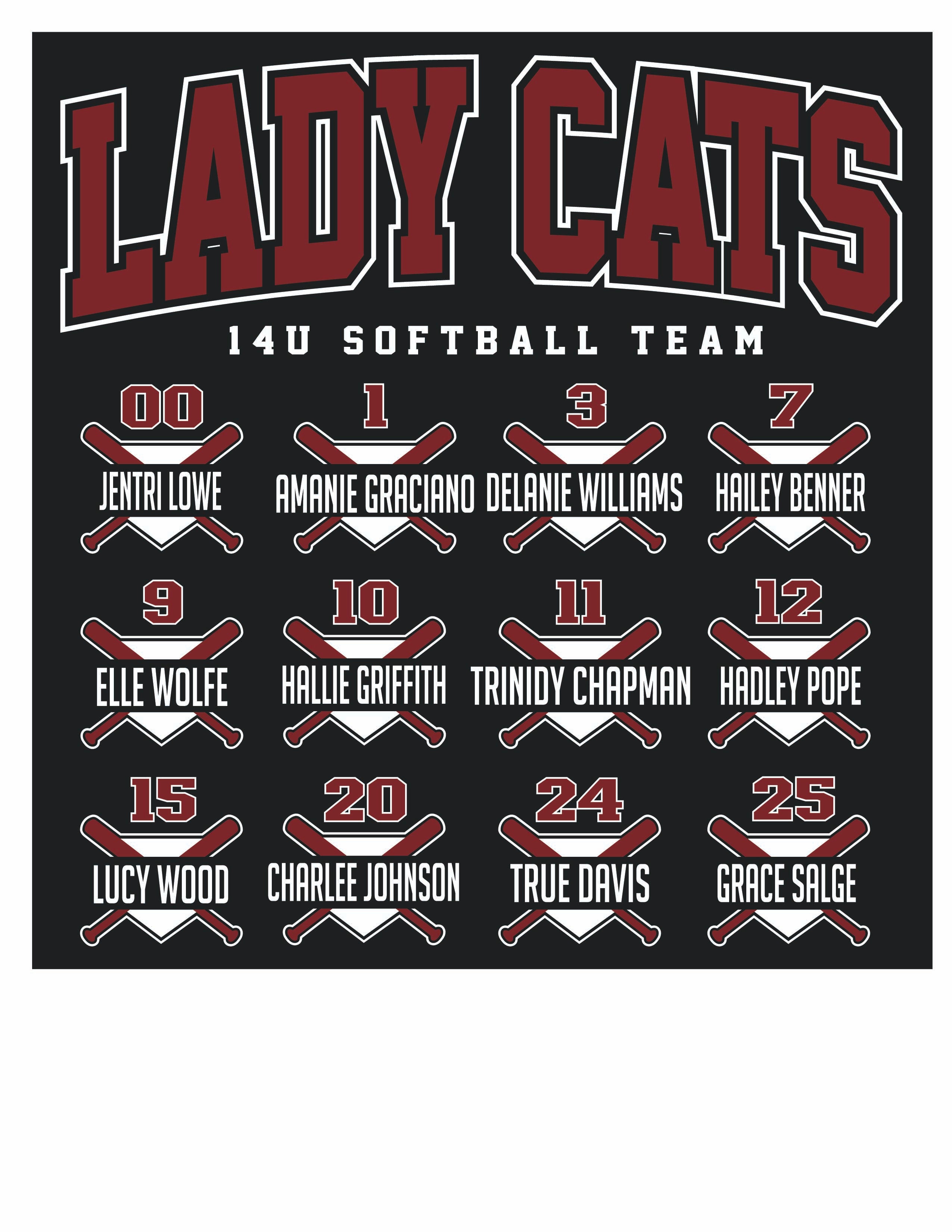 This is a Pre-Order!  The DEADLINE to order is on Wednesday, March 18th. Show your support for the Hawley Lady Cats Softball team with some merchandise.  Hawley Lady Cats design on the front with Roster on the Back of a Black Tee.  6 different shirt options to choose from Short Sleeve or Long Sleeve - Cotton or Wicking, Crewneck Sweatshirt or Hoodie.