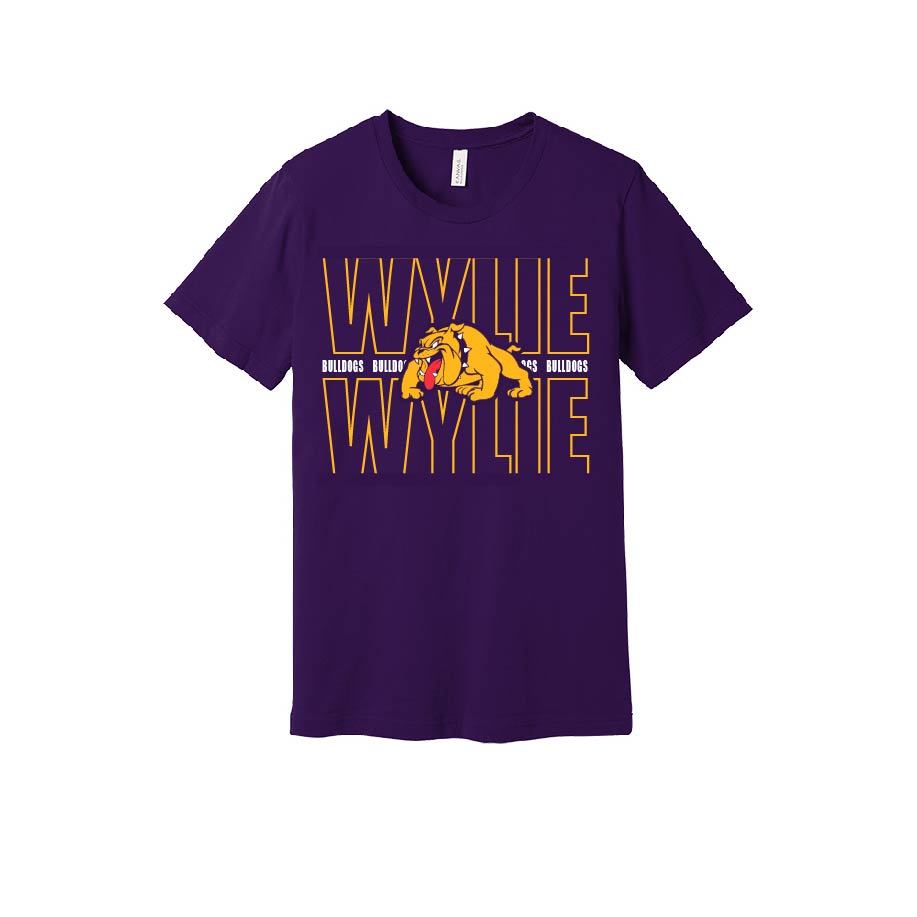 This is a PRE-ORDER...Deadline to order is Sunday, March 8th! Show your spirit with a Wylie Bulldogs tee in support of the Wylie PTO! 2 different options of shirt styles to choose from. Outline Wylie Bulldog design on the front of a Purple tee.