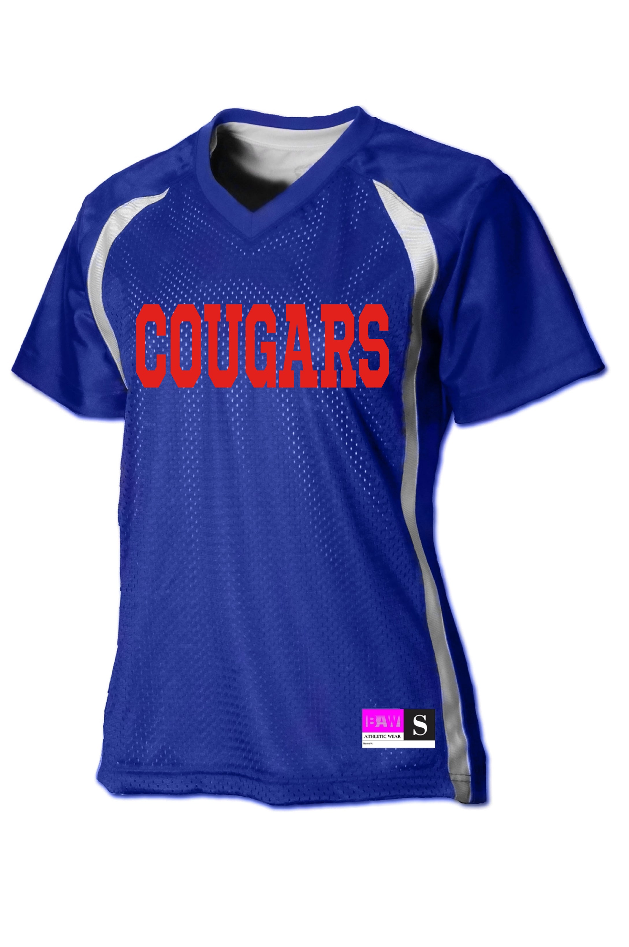 Show your spirit on the sidelines this season with a Cooper Cougars ladies fit football jersey. Royal with White Stripe down the side. Cougars on the front in Red. We can Customize them too!