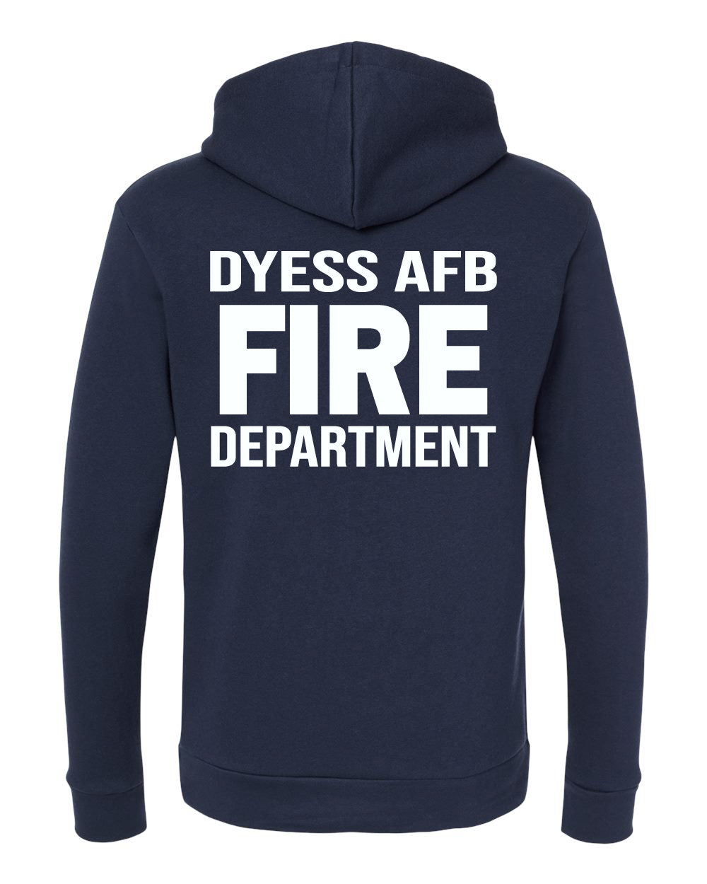 This is a Pre-Order!  Grab a Dyess Firefighters Association lightweight hoodie today!  2 colors of shirts to choose from Black or Midnight Navy.  White print on the left chest and full back.