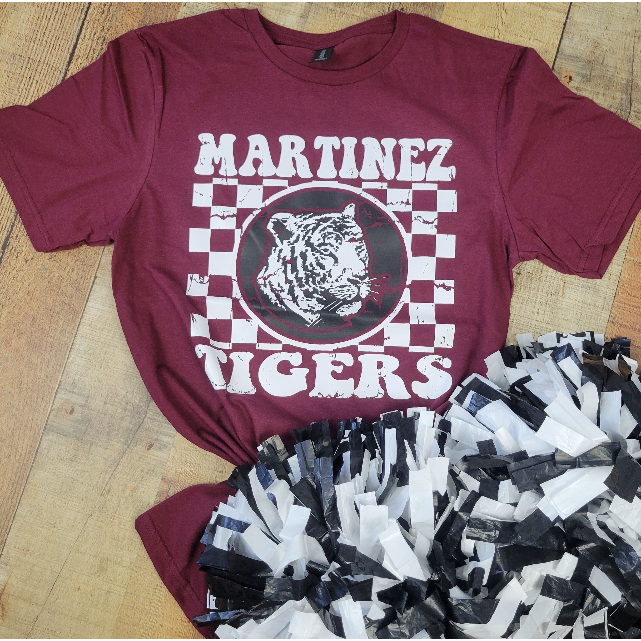 Show your Spirit with the perfect Martinez Tigers Checkered T-Shirt!