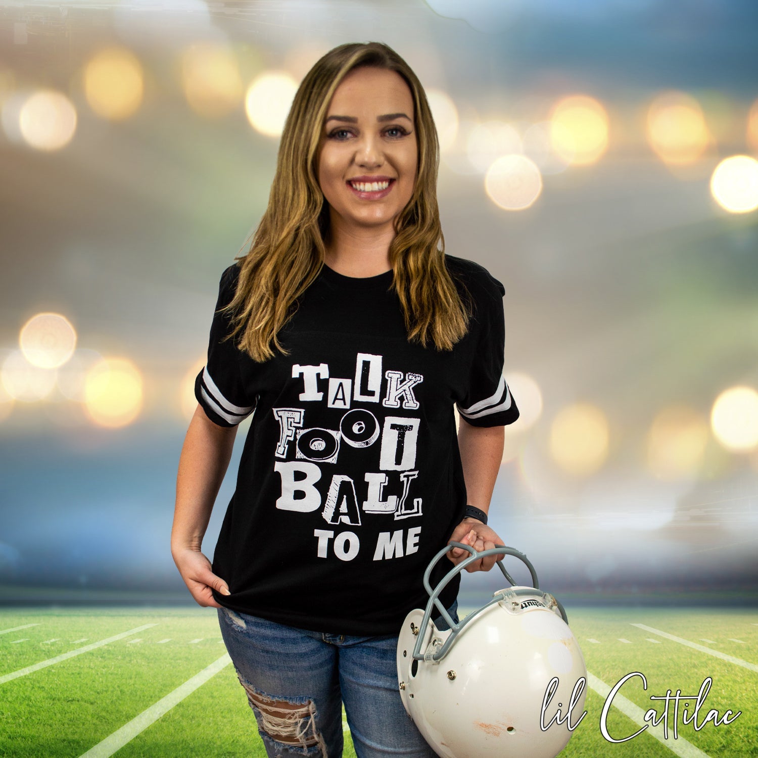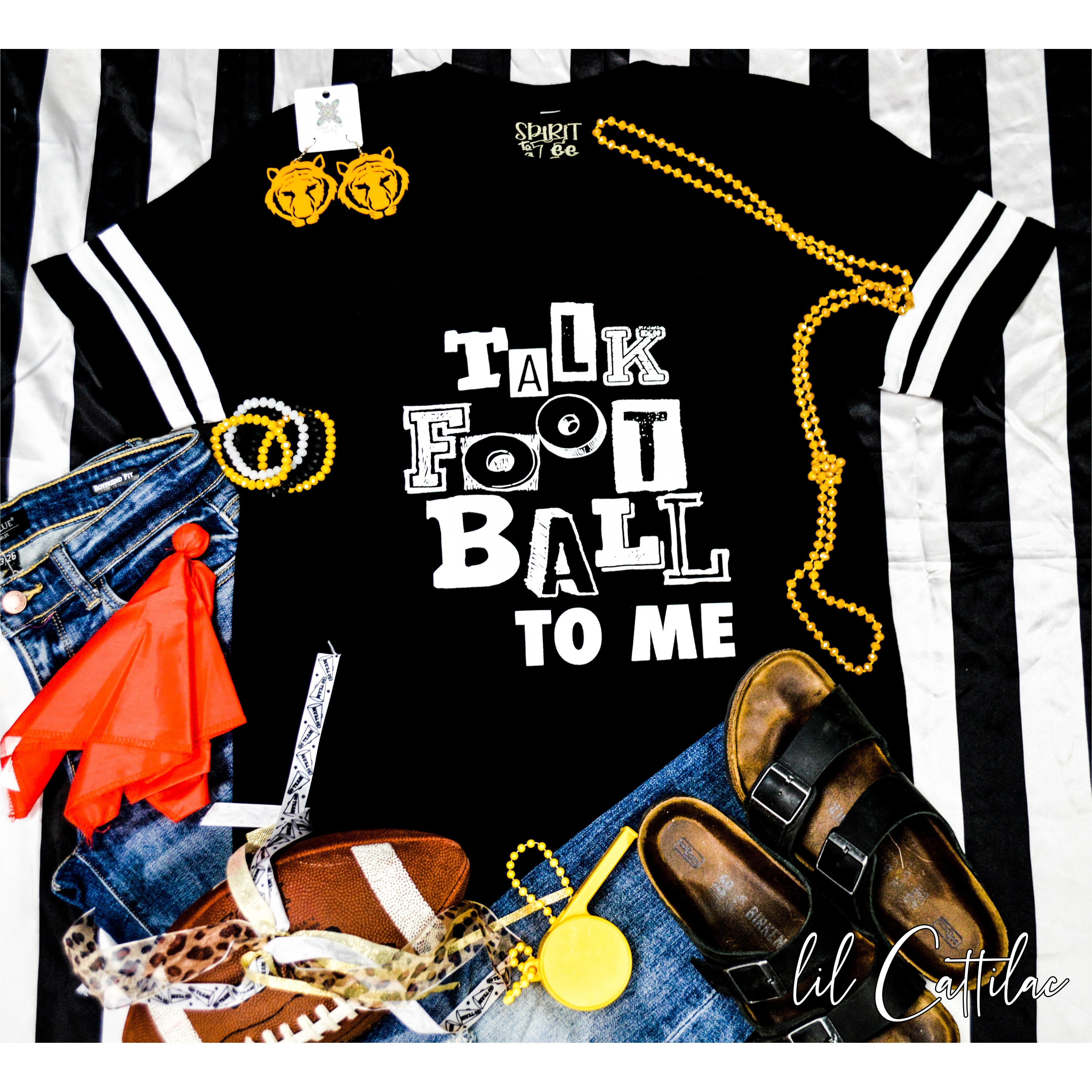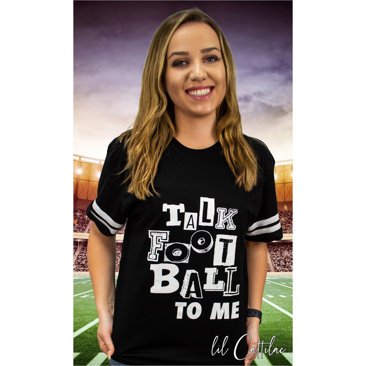 Talk football to me is such a fun shirt. This black graphic tee with white striped sleeves and white lettering will have everyone wanting one. Who doesn’t love football?
