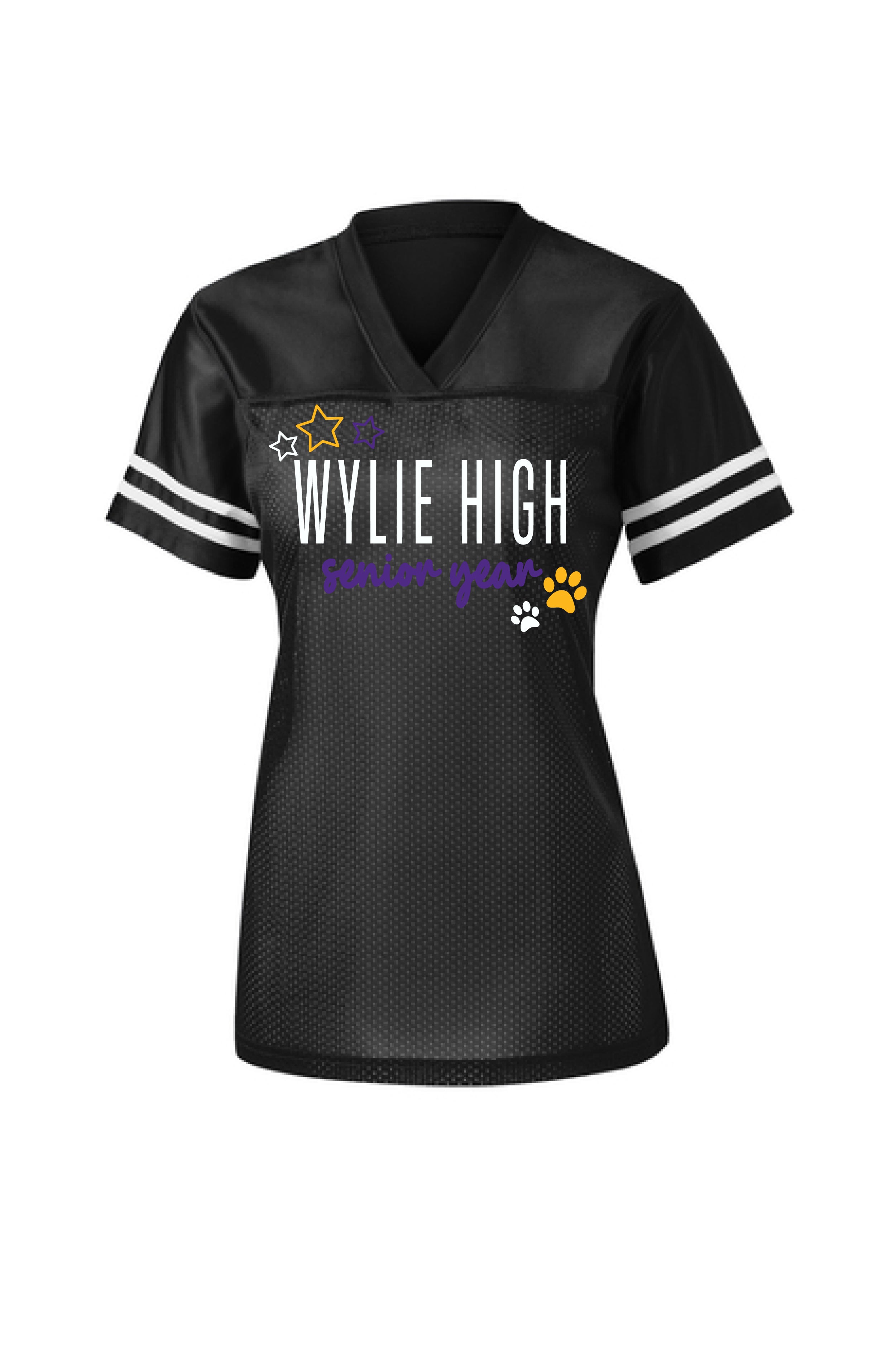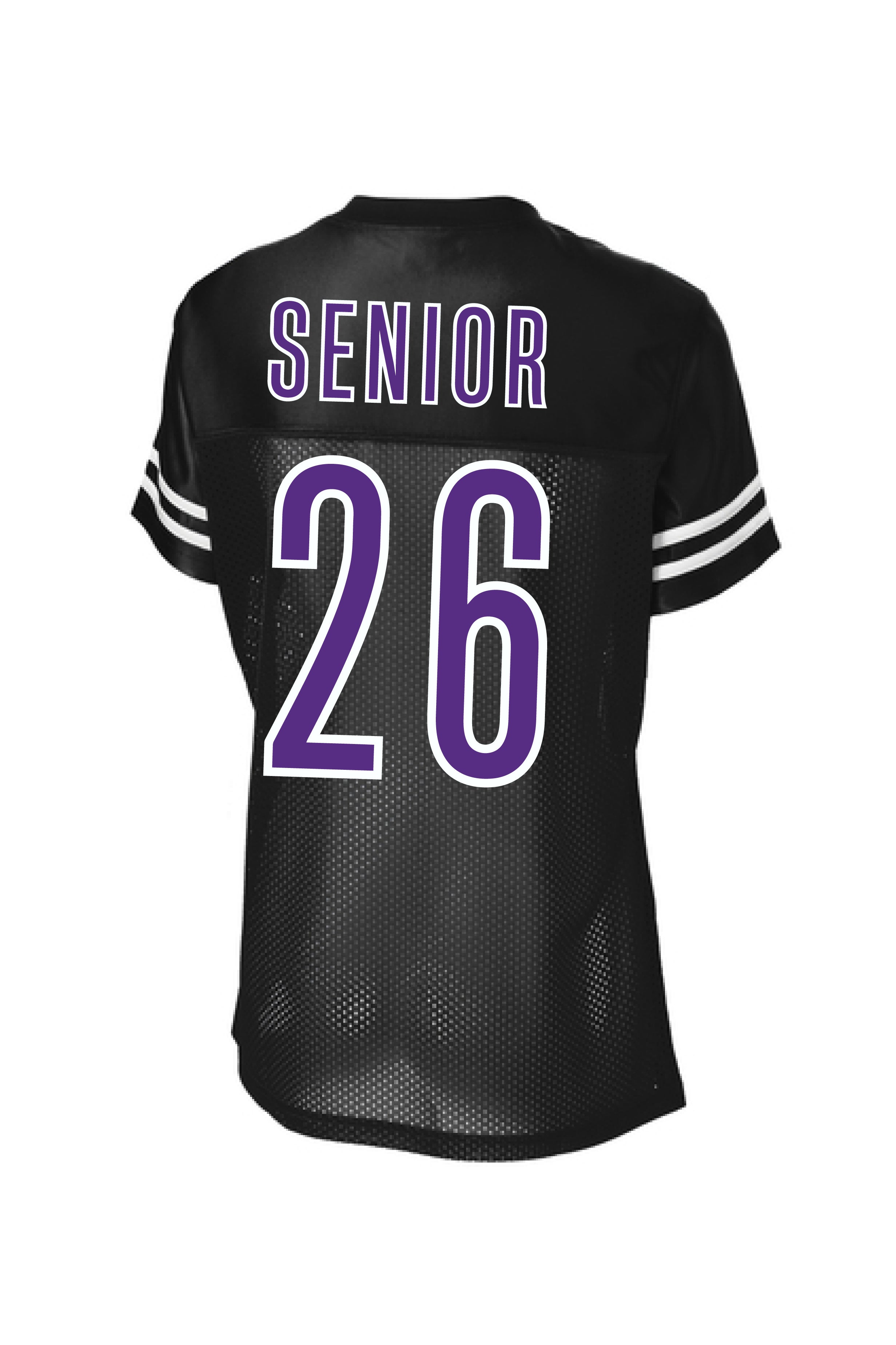 This is a Pre-Order. Let's show our Seniors some love with a jersey! This is a LADIES fit Black with White Stripes Jersey. Lettering is Purple, White & Gold Glitter. Design on the front and back.